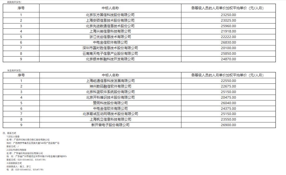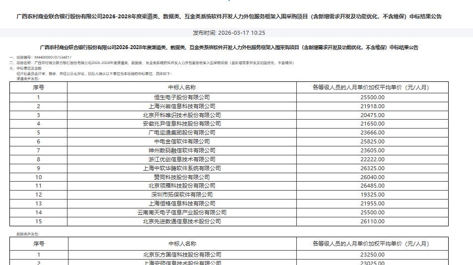 广西农村商业联合银行股份有限公司2026-2028年度渠道类、数据类、互金类系统软件开发人力外包服务框架入围采购项目中标结果公告